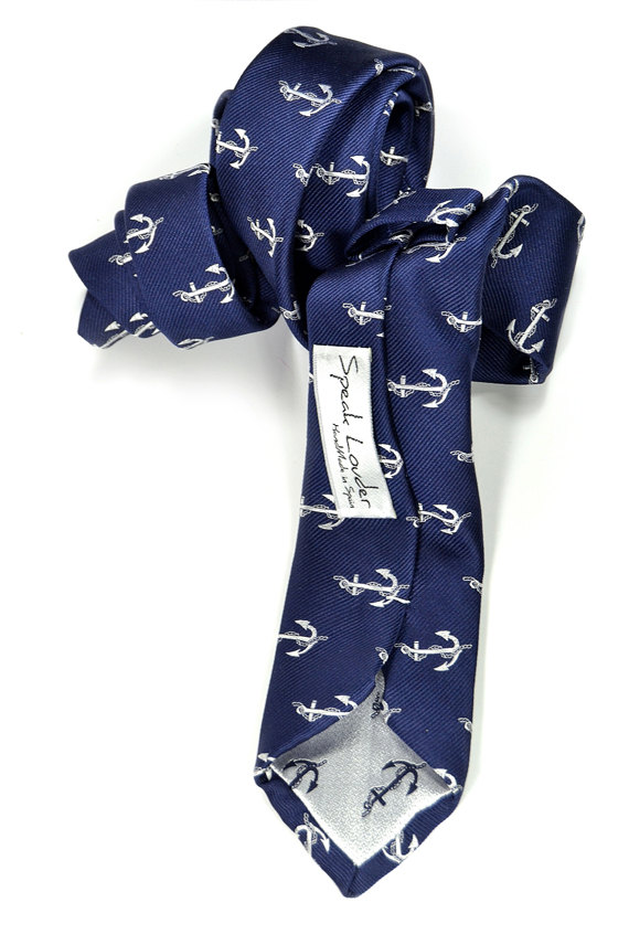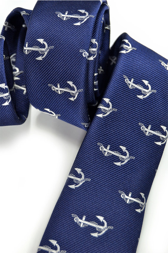 This modern tie, with Silver anchors in a navy blue background silk necktie- perfect for those who love the sea, boats and navy blue ties-